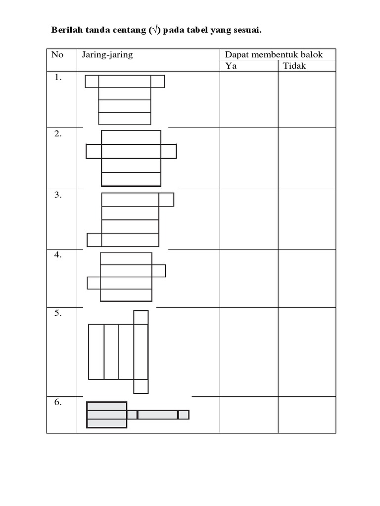 Berdasarkan gambar di atas, bisa kita ketahui bahwa setiap sisi mempunyai pasangan (ada 2 sisi yang sama, 2 sisi berwarna biru, 2 sisi berwarna kuning dan 2 sisi berwarna hijau. Jika nomor 3 sebagai alas kubus, nomor berapakah yang menjadi tutup kubus? 3.2 / 5 ( 65 votes ) contoh gambar jaring. Bidang sisi yang berhadapan luasnya sama. Latihan soal jaring jaring kubus balok draft. Jika nomor 1 sebagai alas kubus, nomor berapakah yang menjadi tutup kubus? Volume balok = 1.785 dm³ luas alas. Volume = 480 cm3 p = 10 l = 8. Menggambar balok sebenarnya cukup mudah dan tidak jauh berbeda dengan kubus. Play this game to review mathematics. Nah di bawah ini terdapat gambaran salah satu dari variasi jaring jaring baloknya yaitu : Volume balok = 1.785 dm³ luas bantalan. Pada umumnya bangun ruang yang telah kita kenal adalah balok, kubus, prisma, limas, kerucut, tabung dan bola.