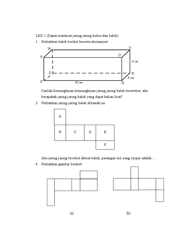 Jb3 Blog Lbb from lbbku.files.wordpress.com Berapakah tinggi dari balok tersebut? Berikuti ini adalah 54 contoh gambar. Adapun balok mempunyai jumlah gambar jaring. Volume balok = 1.785 dm³ luas alas. Latihan soal jaring jaring kubus balok draft. Bidang sisi yang berhadapan luasnya sama. Lalu, gunting kertas karton tersebut mengikuti ruas garis yang nampak. Volume = 480 cm3 p = 10 l = 8.